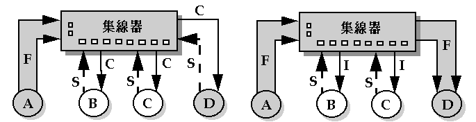 12-8 Demand Priority 通訊協定要求/許可過程範例 如圖12-8 所示,集線器上連接四部工作站 A,B,C,D。假設工作站 A 有一筆訊框要傳送給工作站 D。開始時因為所有工作站都沒有訊框傳送因此集線器及工作站間都互送「閒置」訊號 (Idle,在圖中以 I 表示)。當工作站 A 想傳送訊框時便送出「要求」(Request, 在圖中以 R 表示) 給集線器,如圖12-8(a) 所示。集線器在收到此要求訊號後便將給工作站 A 的訊號由原來的 Idle 改為「靜止」(Silence , 在圖中以 S 表示),同時以「即將到達」(Incoming, 在圖中以 C 表示) 訊號通知其他所有工作站將有訊框到達,如圖12-8(b) 所示。工作站 A 此時便可以開始傳送訊框給集線器,而其他所有工作站則以「靜止」表示等待訊框的到來,如圖12-8(c) 所示。集線器在收到訊框後根據其上的目的地位址將訊框轉送給工作站 D,如圖12-8(d) 所示。當工作站 A 將訊框傳送完畢時便用 I 及 S 訊號通知集線器,如圖12-8(e) 所示。當集線器將訊框傳送給工作站 D 後所有的訊號便恢復為 Idle,如圖12-8(f) 所示。此時工作站便可以提出傳送訊框的需求。Demand Priority