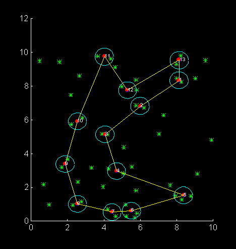 "Traveling salesperson problem" is a typical problem for searching the optimal path to reach each desired point . In some cases , we must not be passing through each point exactly , instead of being close to some accepted distance . This is a new trial to find a optimal path to make each point be in a accepted distance.