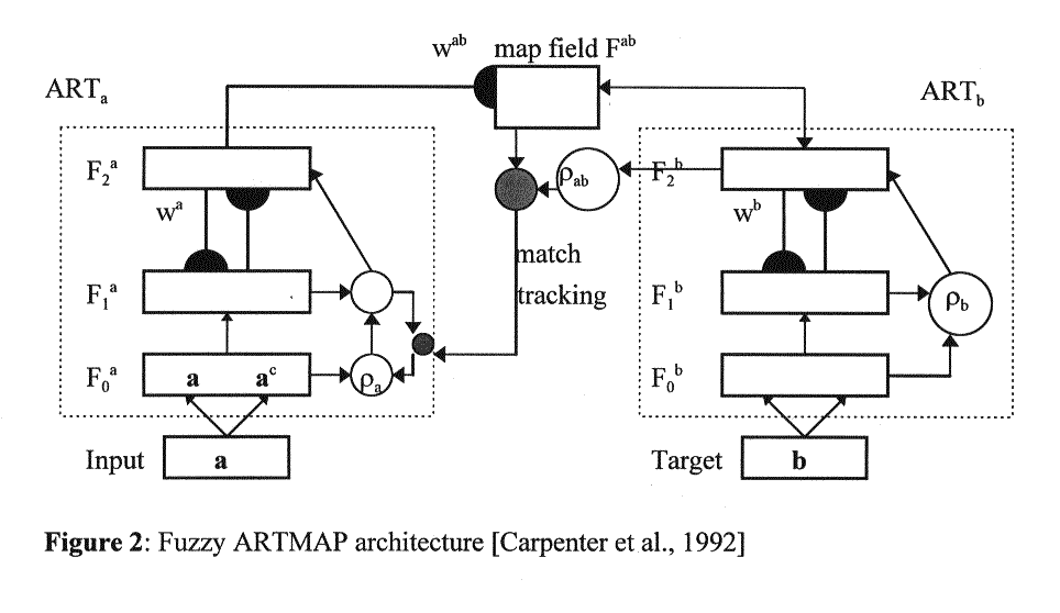 Fuzzy ART is similar to ART1,but use fuzzy operations instead of logical operations in weight changing and category choice. The architecuture of Fuzzy ARTMAP consists of two fuzzy ART module.