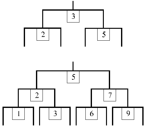 A letter is added according to the following procedure. If its number is lower than the number of the letter on the stick, it is added to the left hand side of the balance. If its number is higher, it is added to the right hand side. Following this procedure repeatedly, eventually a free thread is found. Then the letter is fixed on a fresh stick (having two free threads, one at each end) which is tied to the free thread. Then, starting at the top working downwards, all sticks are checked for being balanced. If a stick is unbalanced, a balancing step is executed. Because a balancing step might result in having other sticks being unbalanced again, the whole tree is checked again from top to bottom for unbalanced sticks. This is done until no unbalanced sticks are found.