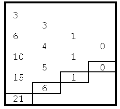 To extrapolate using a difference table we assume the n-1st differences are constant (since we have no additional information to refute that assumption). Given that assumption, we can compute the next entry in the n-2nd difference column, the n-3rd difference column, and so forth until we compute the next entry in the first column which, of course, is the next value in the sequence. The table below shows the four additional entries (in boxes) added to the table to compute the next entry in the example sequence, which in this case is 21. We could obviously continue this extrapolation process as far as desired by adding additional entries to the columns using the assumption that the n-1st differences are constant.