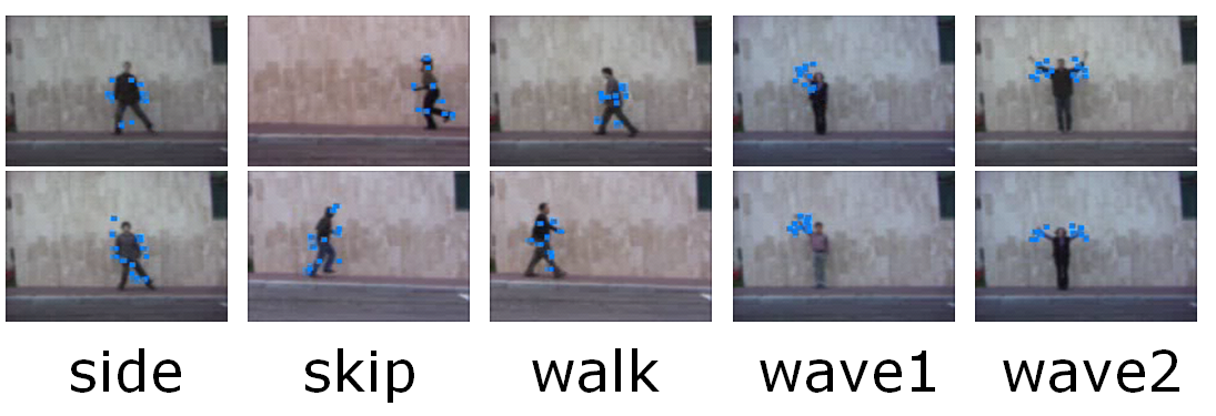 We extend the histogram-based method to the detection of space-time interest points, and apply the detector to action classification. We use the human action database provided by Gorelick et al. for evaluation. The database contains ten types of actions, and for each action we use nine videos of the same action performed by different people. We ignore the silhouette information since our method does not assume a known background. The result of leave-one-out test is shown below in the confusion matrix.