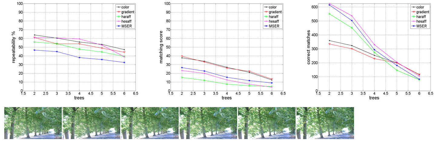 The proposed detectors achieve good performance for the tasks of matching textured scenes, e.g., the 'wall' sequence and the 'trees' sequence shown below (click to enlarge). The performance is evaluated by the repeatability and the matching score, using the code and datasets created by Mikolajczyk et al.. The black lines are the results of the color-histogram detector; the red lines are obtained by the oriented-gradient-histogram detector. More evaluation results can be found in our paper.