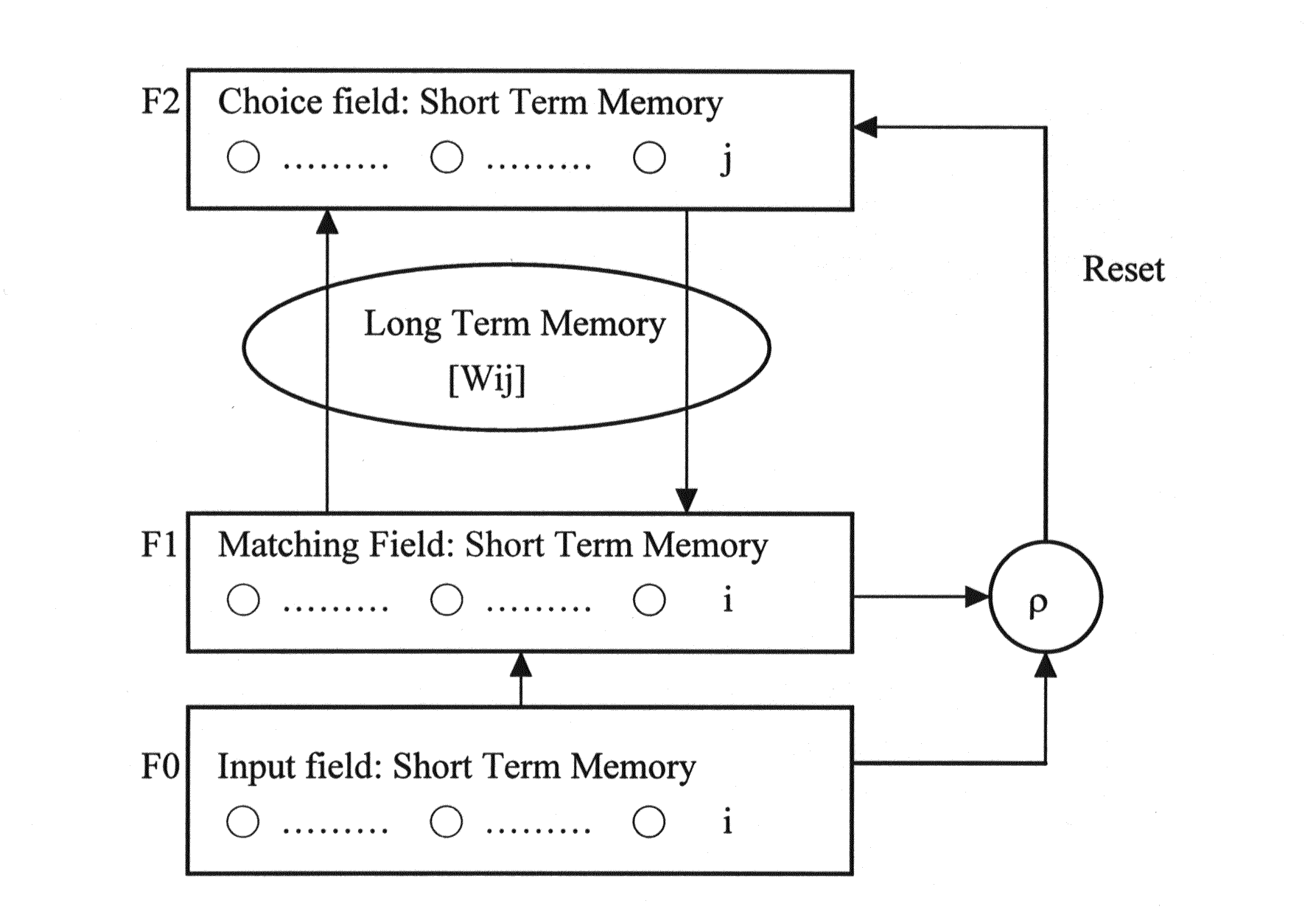Fuzzy ART use three layers(F0,F1,F2) to cluster input data. F0 contains raw(preprocessing) data , F2 selects the highest score node from choice function and sends it to F1. F1 checks that is the node satisfing vigilance.
