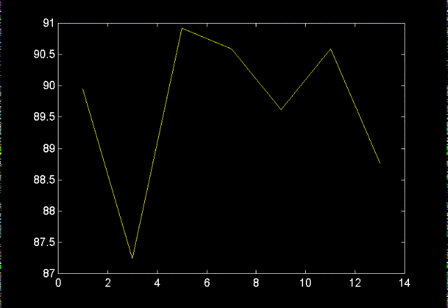 K-Nearest-Neighbor classification, K from 1 to 13, 5 iterations.