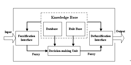 對於一個基本的控制問題,目的是要根據回授所得來的觀測量來確定給予受控體之控制力,實際上就是要獲得一種輸入輸出的對應關係。模糊控制是一種建立在人工經驗基礎上的智慧型控制,特性是不需要依賴受控體的數學模型,利用人的操作經驗、知識及推理技術,即可得到對應之控制動作。其推理模型請見圖所示。主要可以分為四個部份: