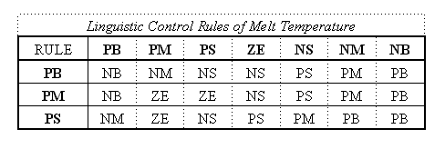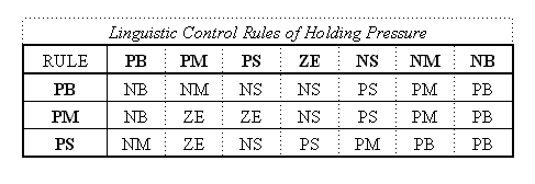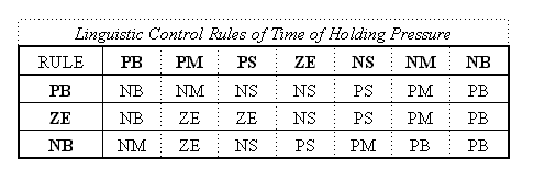 在本研究中所用來調整成形參數的控制法則為模糊控制器,使用模糊控制的原因是由於射出機內部裝配有高非線性(Nonlinear)、不確定(Uncertain)和時變(Time-varient)的油壓致動元件,無法以簡單的數學模型來描述系統之特徵,利用模糊系統建立射出成形經驗,可將控制策略以輸入與輸出動作的查詢表方式轉換成操作量。輸入項目的量化請見表1,2所示。