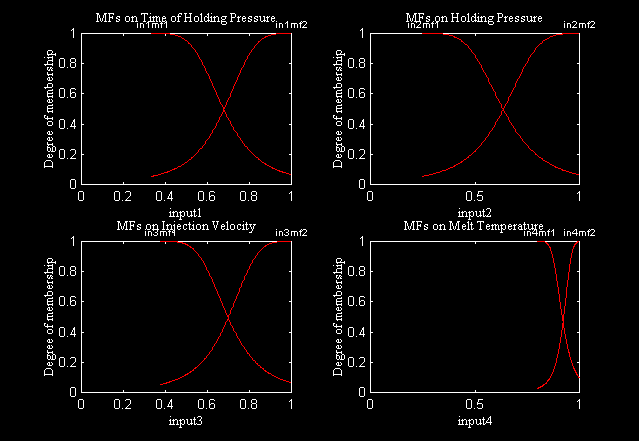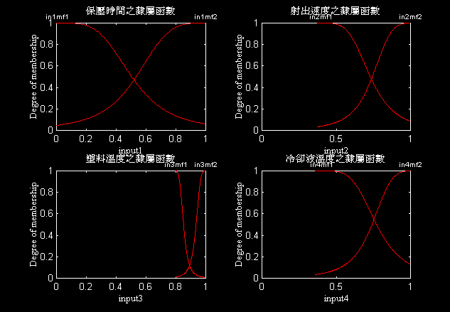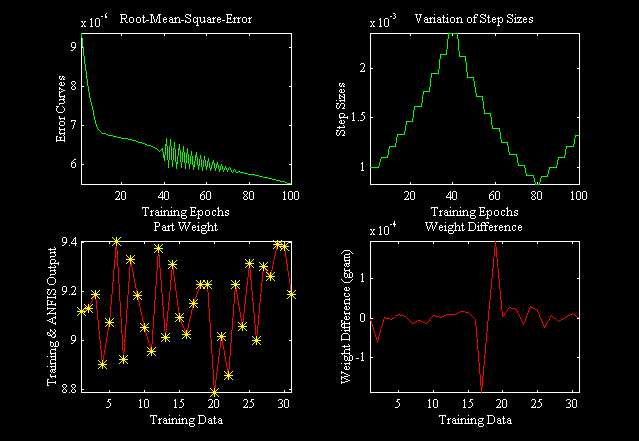 本研究利用ANFIS來建立系統模型,以六個成形參數選取四個為輸入,重量及收縮率為輸出;其中每一個輸入包含兩個廣義性鐘形的歸屬函數(GeneralizedBellMembershipFunctions),訓練一百次後,其結果於圖所示。隨著訓練次數的增加,均方根誤差(RMSE)持續下降,可達到的最低值為 公克,而代表學習速度的步進量(Step Sizes)也會自動調整至最佳值。